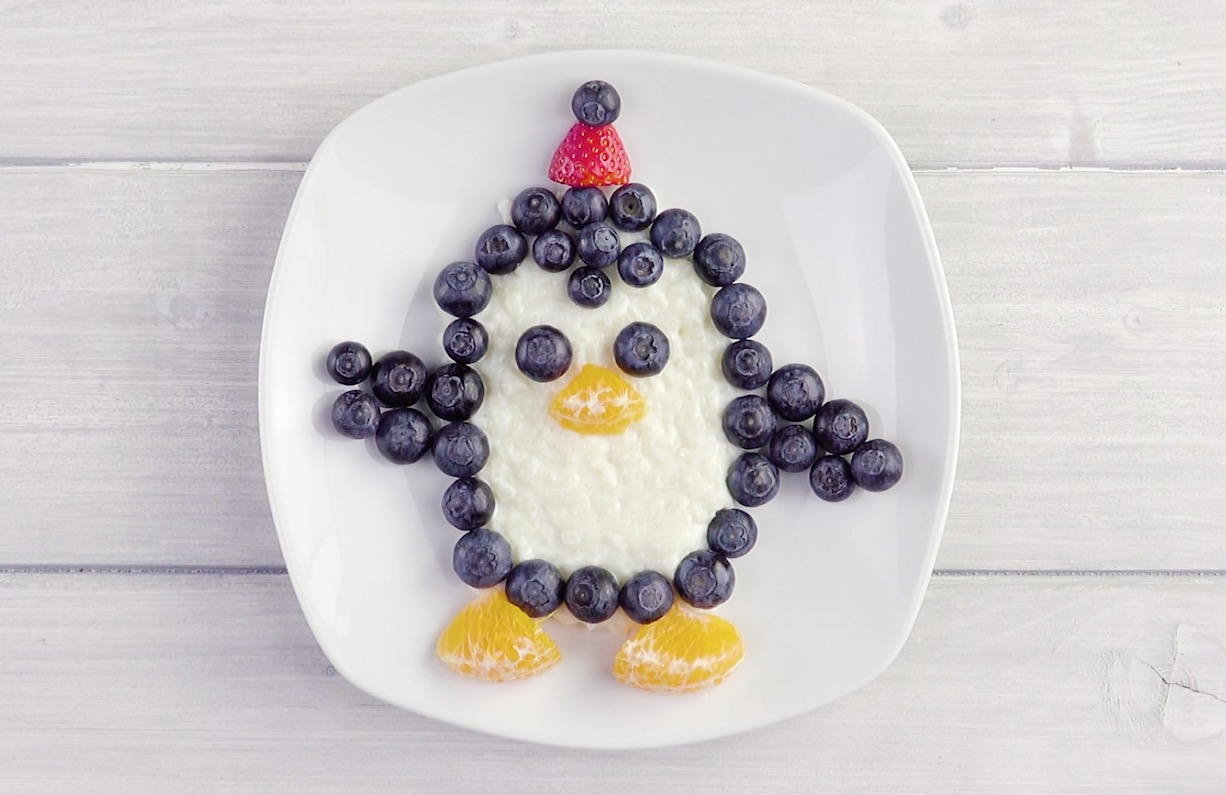 Verteile den Milchreis in einem Oval auf einem Teller und drücke ihn mit dem Löffelrücken flach. Verziere den Milchreis nun mit Blaubeeren, Mandarinenstücken und der halben Erdbeere zu einem putzigen Pinguinküken.