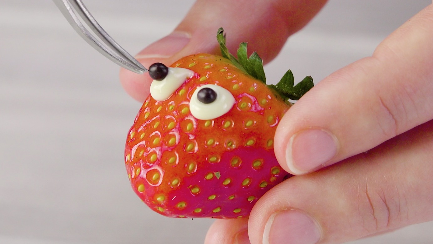 1.) Mache als Augen zwei Tupfer weiße Schokolade auf eine Erdbeere und setze jeweils eine Schokoperle in die Mitte davon.