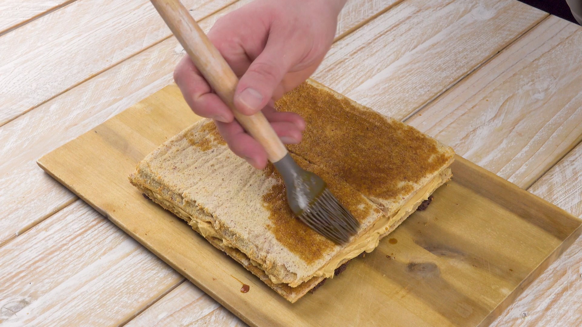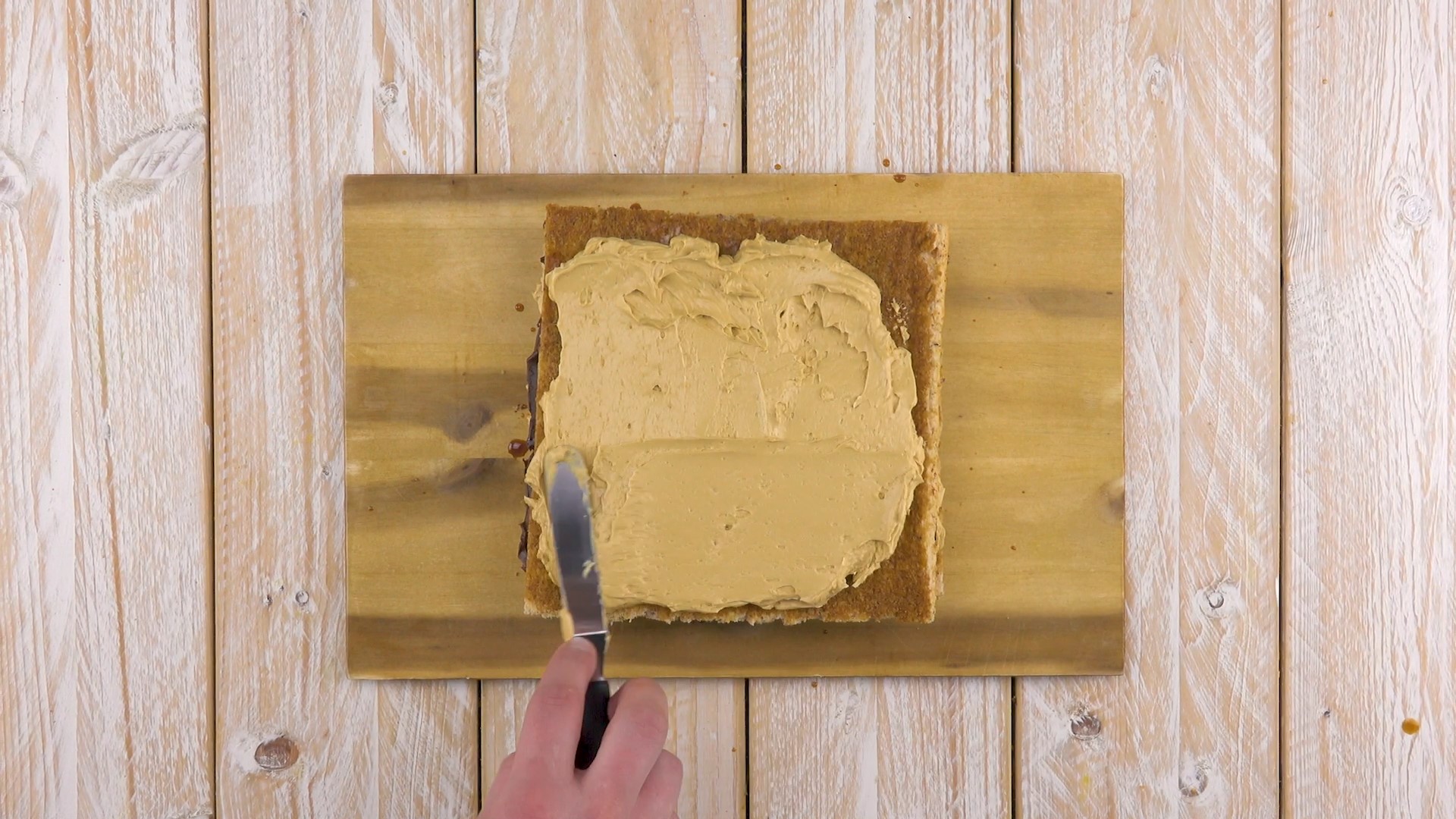 5.) Verstreiche die Hälfte der Creme auf der Kaffeeseite des Kuchenbodens mit der Knusperschicht. Belege die Cremeschicht nun mit dem dritten, zusammengesetzten Quadrat und bestreiche dieses wieder mit Kaffee.