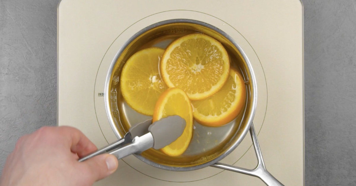1. Schneide die Orange und die Grapefruit in je 3 mm dicke Scheiben. Lasse nun Zucker und Wasser in einem Topf aufkochen und verteile das Zuckerwasser anschließend auf zwei Töpfe. Lege nun die Orangenscheiben in den einen und die Grapefruitscheiben in den anderen Topf und lasse beide für etwa 3 Stunden ziehen. Färbe die Flüssigkeit nach Bedarf mit Lebensmittelfarbe ein.