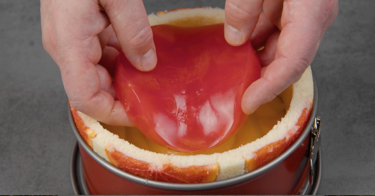 9. Löse das Gelee nach dem Abkühlen vorsichtig aus der Form und lege es im Ganzen als Deckschicht auf die Orangencreme.