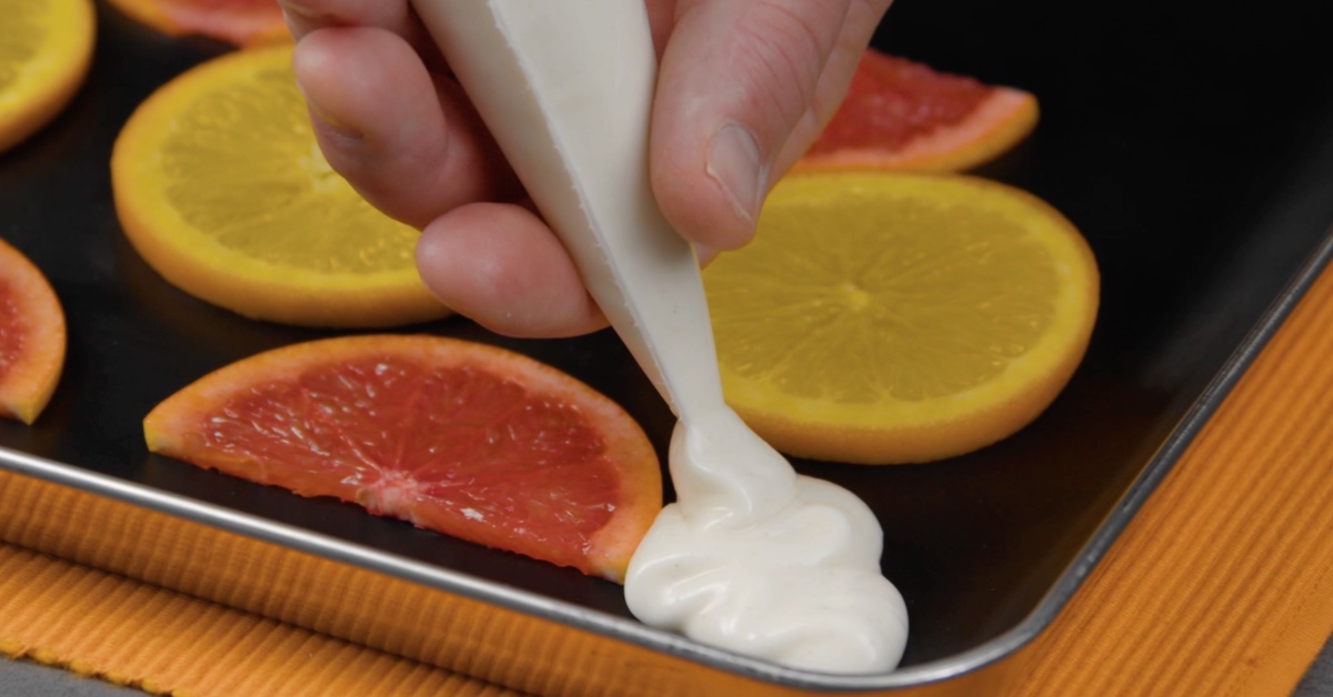 12. Zum Abschluss werden abwechselnd weiße und orange Sahnetupfen als Dekoration aufgespritzt. Fertig ist die saftige Orangen-Grapefruit-Torte.