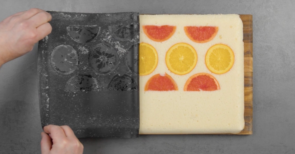 4. Stürze den Kuchenteig auf ein Brett und ziehe die Silikonbackmatte ab.