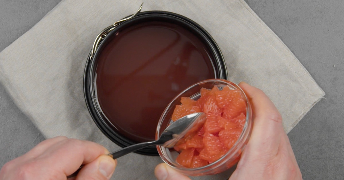 8. Auch für die Zubereitung des Gelees weichst du die Gelatine wieder in Wasser ein und erwärmst sie anschließend in der Mikrowelle. Verrühre sie dann mit dem Grapefruitsaft und dem Zucker und erwärme das Ganze langsam. Gib am Ende die Grapefruitstücke hinzu und gieße das noch flüssige Gelee in eine kleine Springform. Stelle es danach für mindestens drei Stunden kalt.