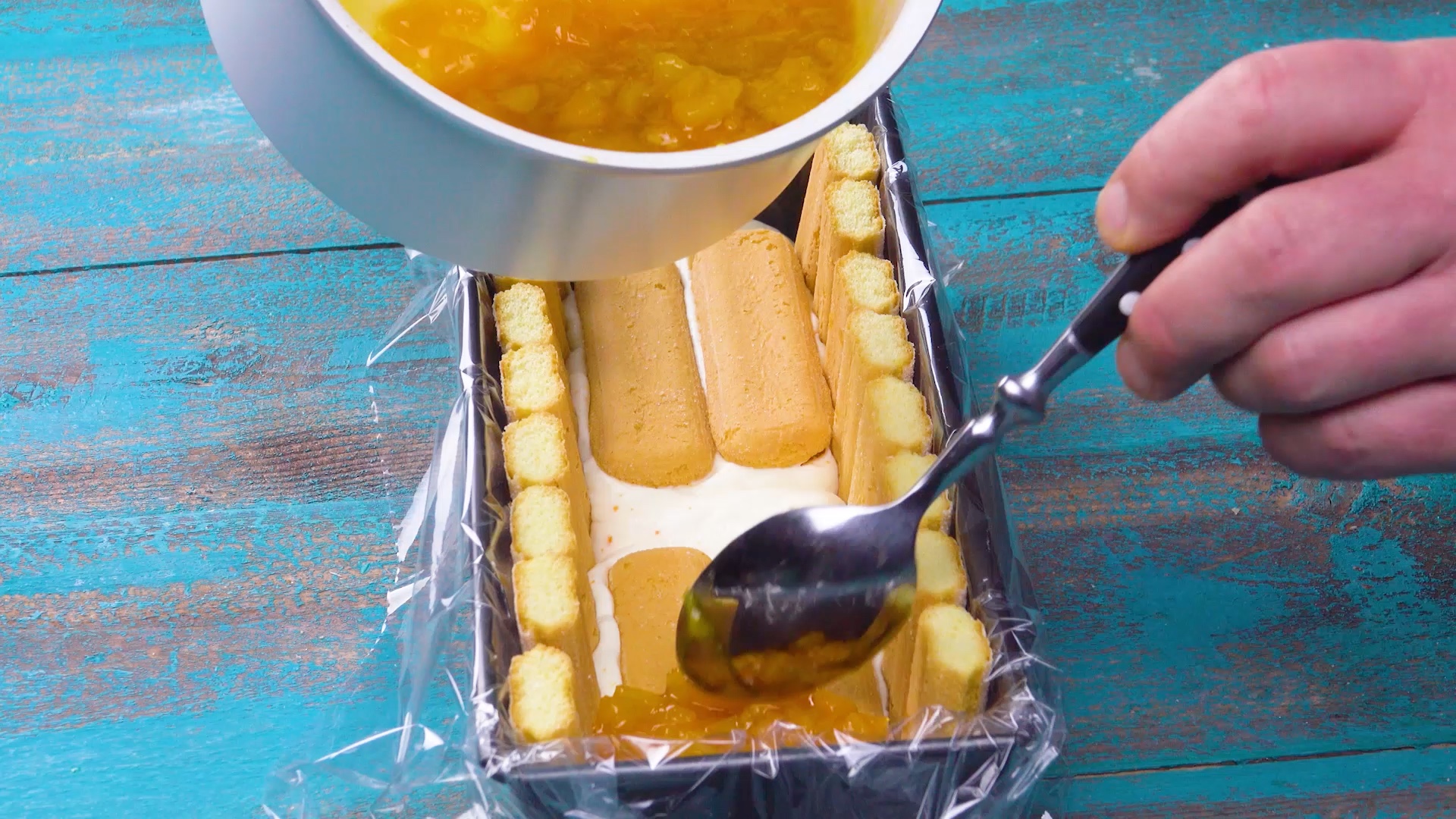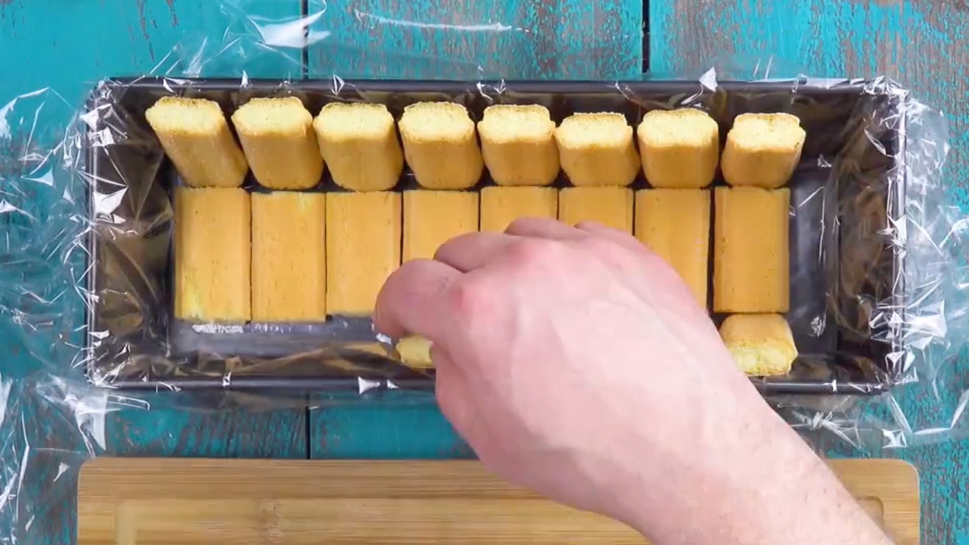 5.) Decke die Creme mit einer Reihe Löffelbiskuits ab. Als Nächstes schlägst du diese in Frischhaltefolie ein und stellst die Form über Nacht kalt.
