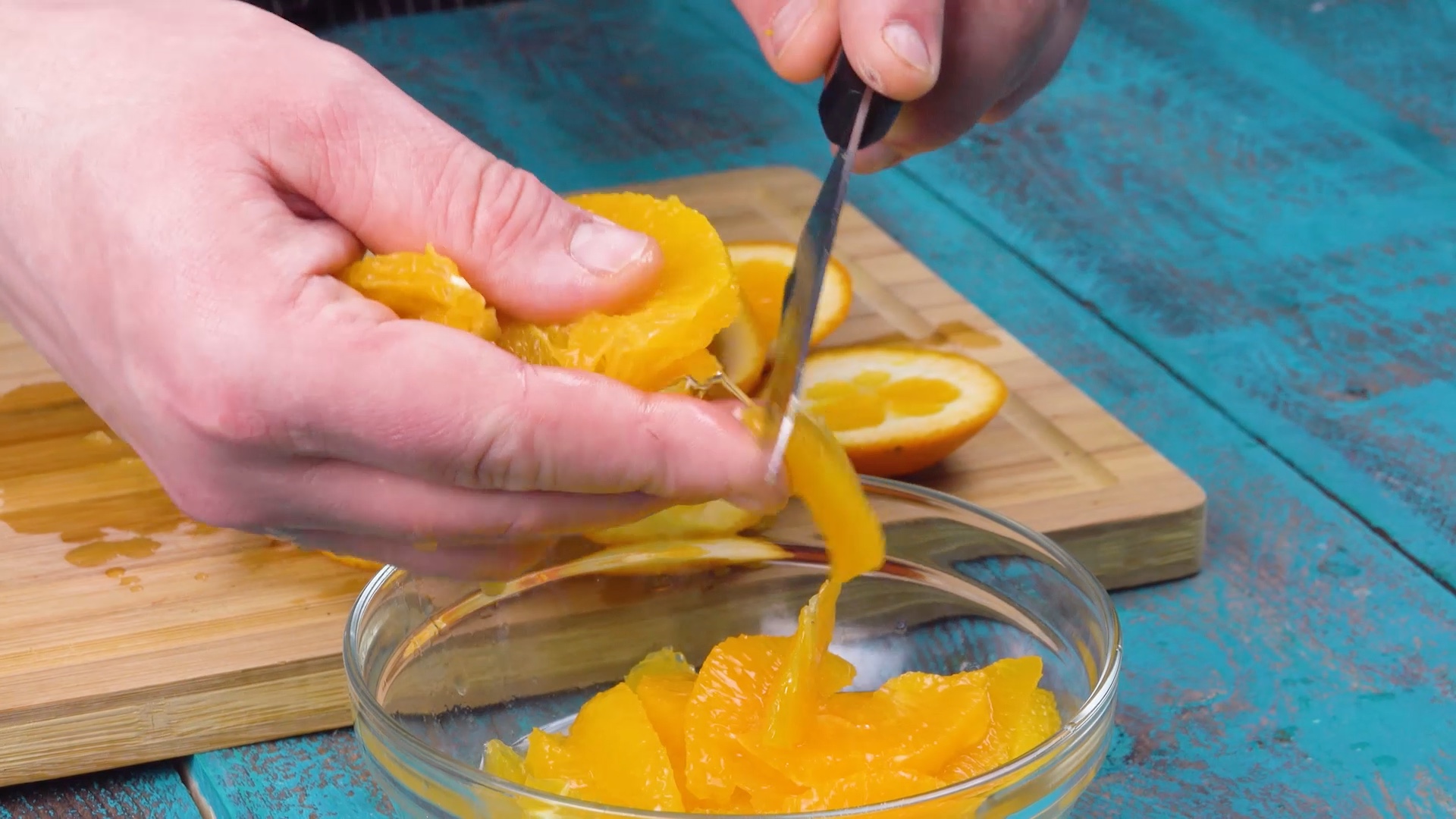 2.) Reibe die Schale von einer der vier Orangen. Anschließend schälst du alle Orangen und filetierst drei von ihnen. Die vierte hingegen presst du aus. Karamellisiere 50 Gramm Zucker in einem Topf. Sobald der Zucker braun wird, kann er schnell anbrennen. Um das zu vermeiden, lösche mit den Orangenfilets und -saft ab. Gib die Zimtstange hinzu und koche alles zu einer sirupartigen Konsistenz ein. Damit pinselst du behutsam die ausgelegten Löffelbiskuits ein.