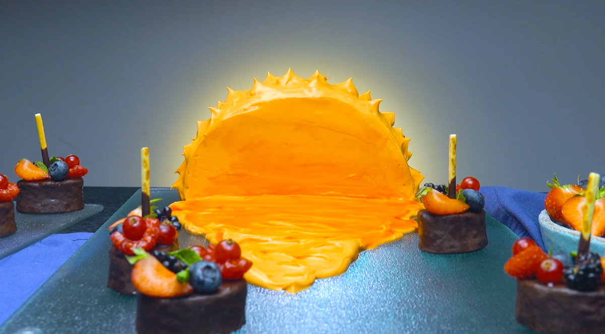 6. Träufle ganz kleine Mengen roter Lebensmittelfarbe auf die Buttercreme und verteile die Creme dann mit einem Löffel, sodass ein Farbverlauf entsteht. Bringe die Buttercreme auf dem Sonnenrand außerdem mit dem Löffel in die Form kleiner Zipfel, die an Sonnenstrahlen erinnern. Stelle den Kuchen für 30 Minuten kalt. Serviere den Sonnenuntergangs-Kuchen zusammen mit den Schokoladen-Bötchen.