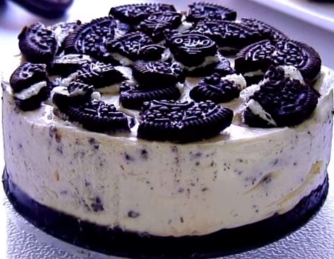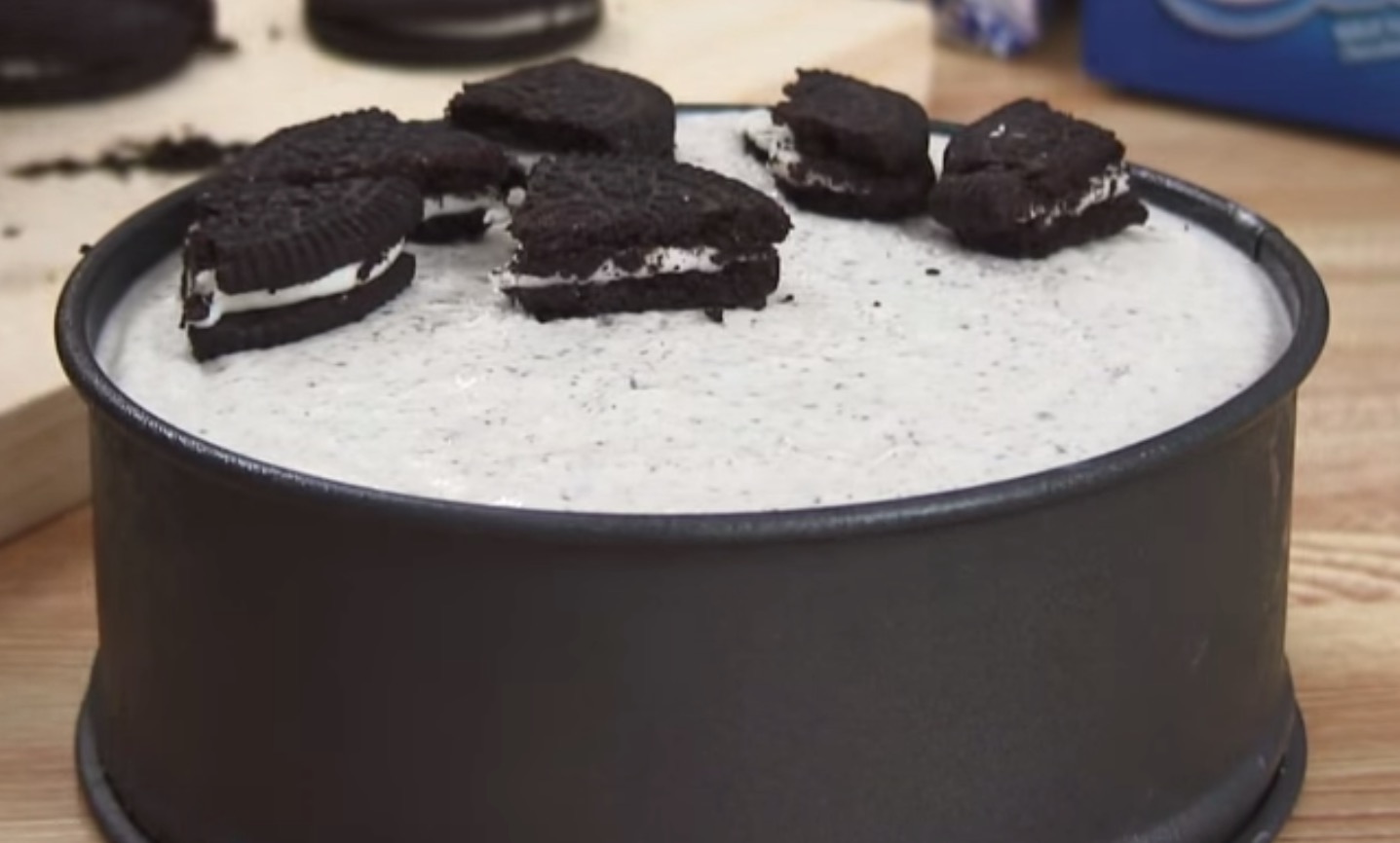 8. Als letztes musst du den Kuchen nur noch für einige Stunden in den Kühlschrank stellen – fertig ist dein leckerer Oreo-Käsekuchen, ganz ohne Backen!