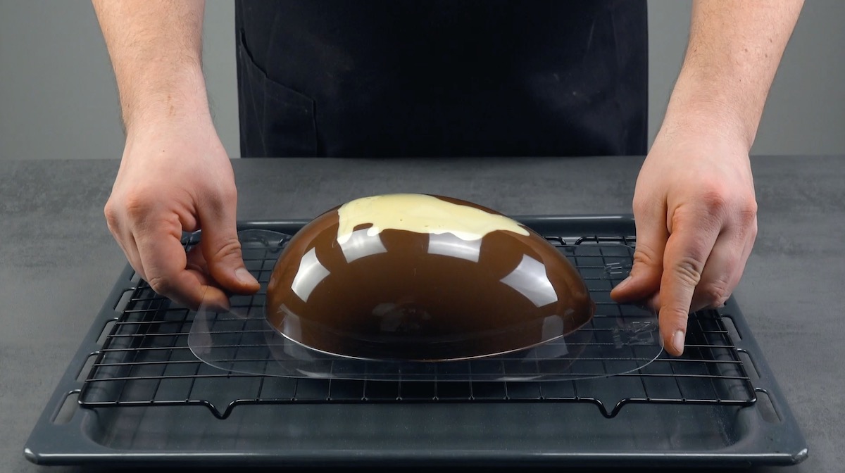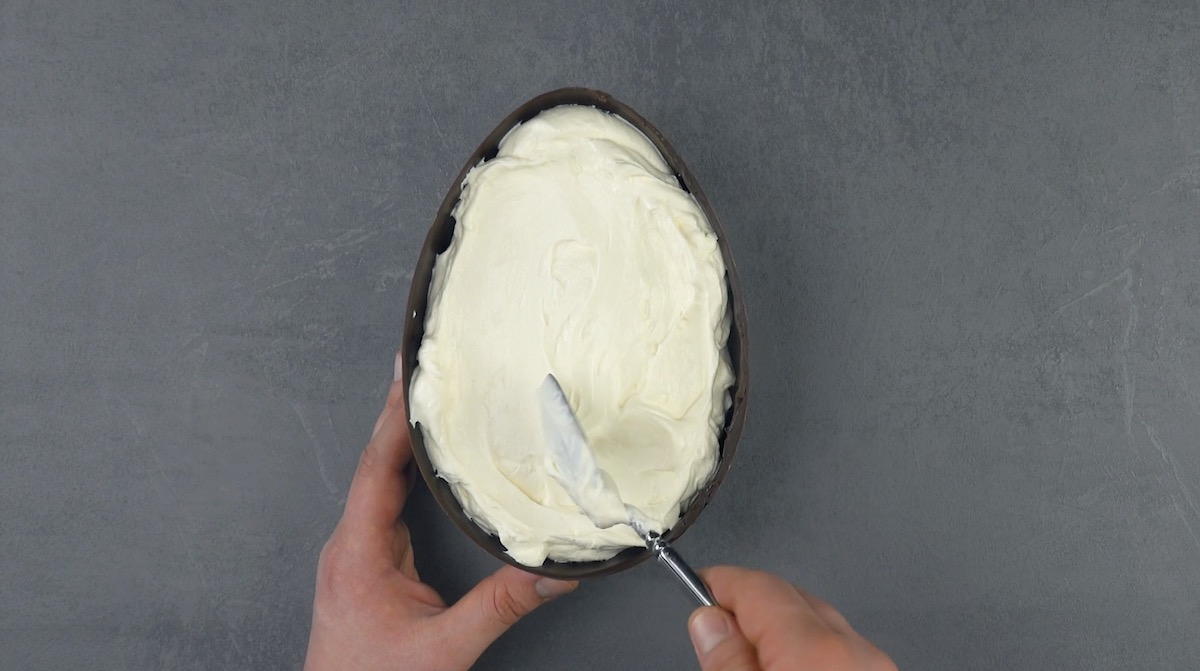10.) Verteile etwas flüssige Schokolade auf den Rändern der Eihälften.