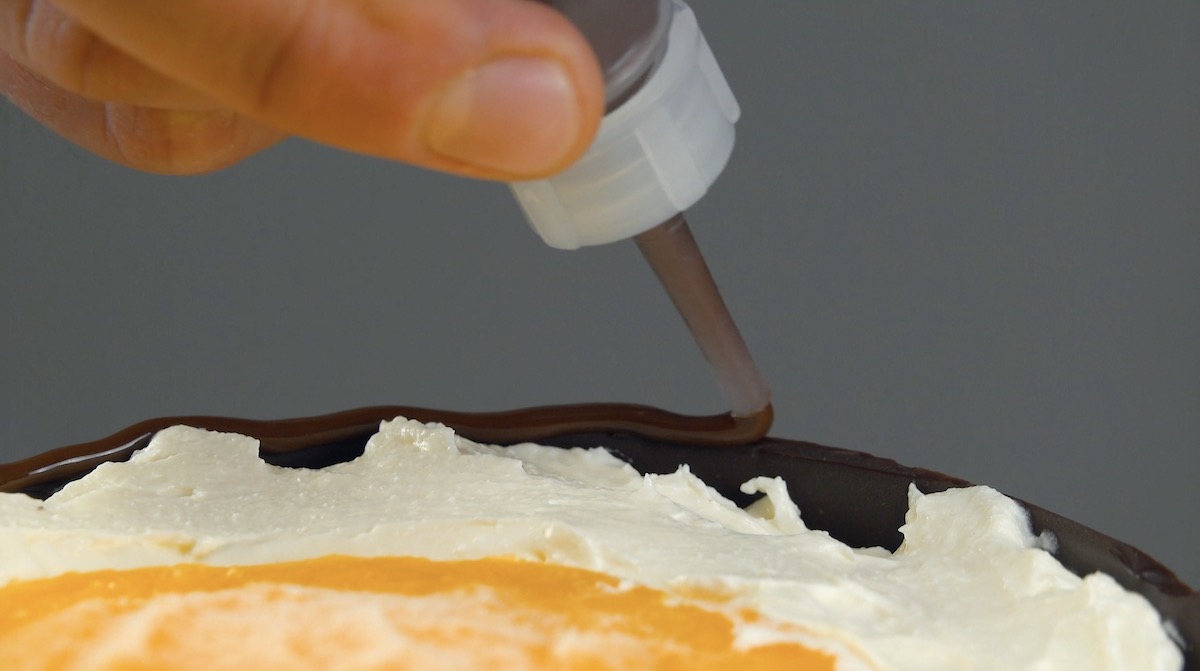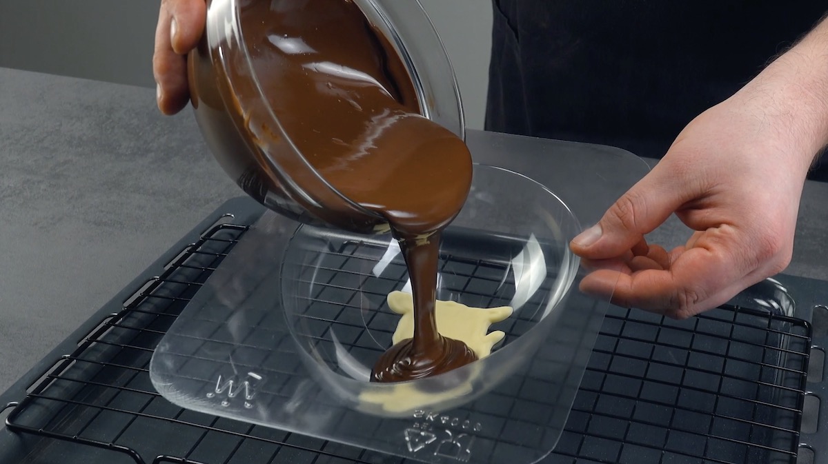 4.) Schwenke die Form hin und her, um die zähflüssige Schokolade gleichmäßig in der Form zu verteilen.