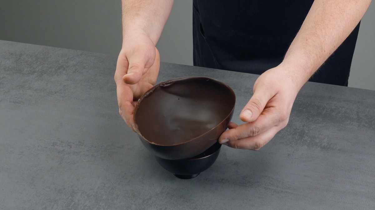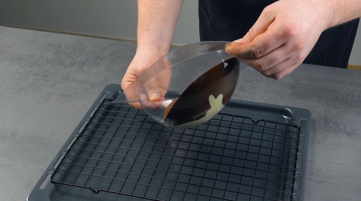 6.) Warte, bis die Schokolade fest geworden ist, löse sie aus der Form und lege sie vorsichtig auf eine kleine Schüssel.