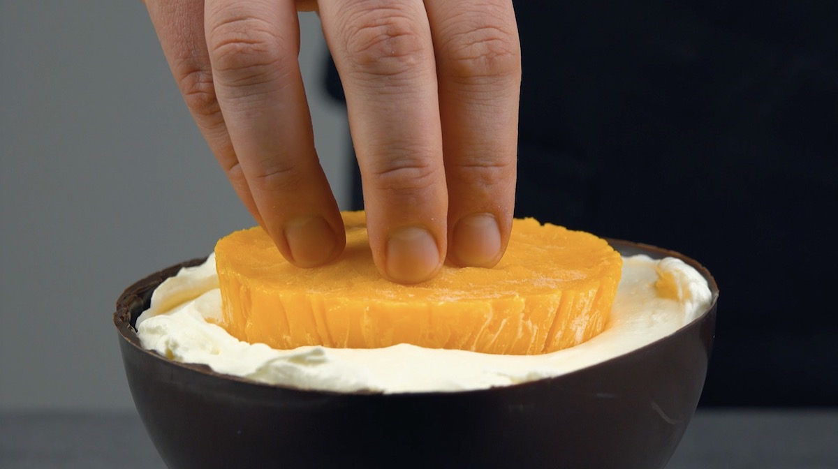 9.) Löse nun die mittlerweile gefrorenen Mangopürees aus ihren Schalen und drücke jede Portion vorsichtig in die Mitte einer Eihälfte.