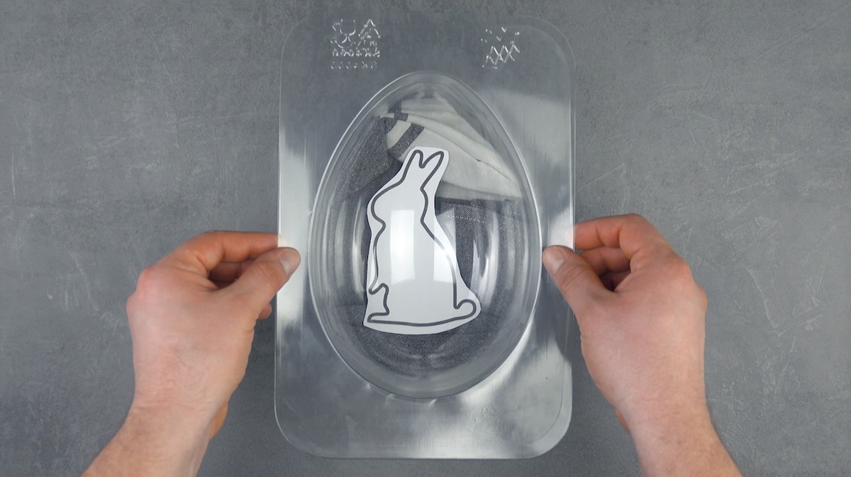 1.) Schneide einen Hasen aus Papier aus und lege ihn in eine Hälfte der Eiform; lege dann die andere Hälfte der Eiform obendrauf.
