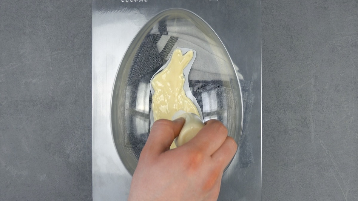 Wiederhole das ganze Prozedere nun für die zweite Eihälfte, wenn du diese ebenfalls mit einem weißen Hasen bestücken möchtest; alternativ kannst du die zweite Hälfte aber einfach nur mit geschmolzener dunkler Schokolade füllen, das spart Zeit, denn dann kannst du beide Eihälften zeitgleich vorbereiten.
