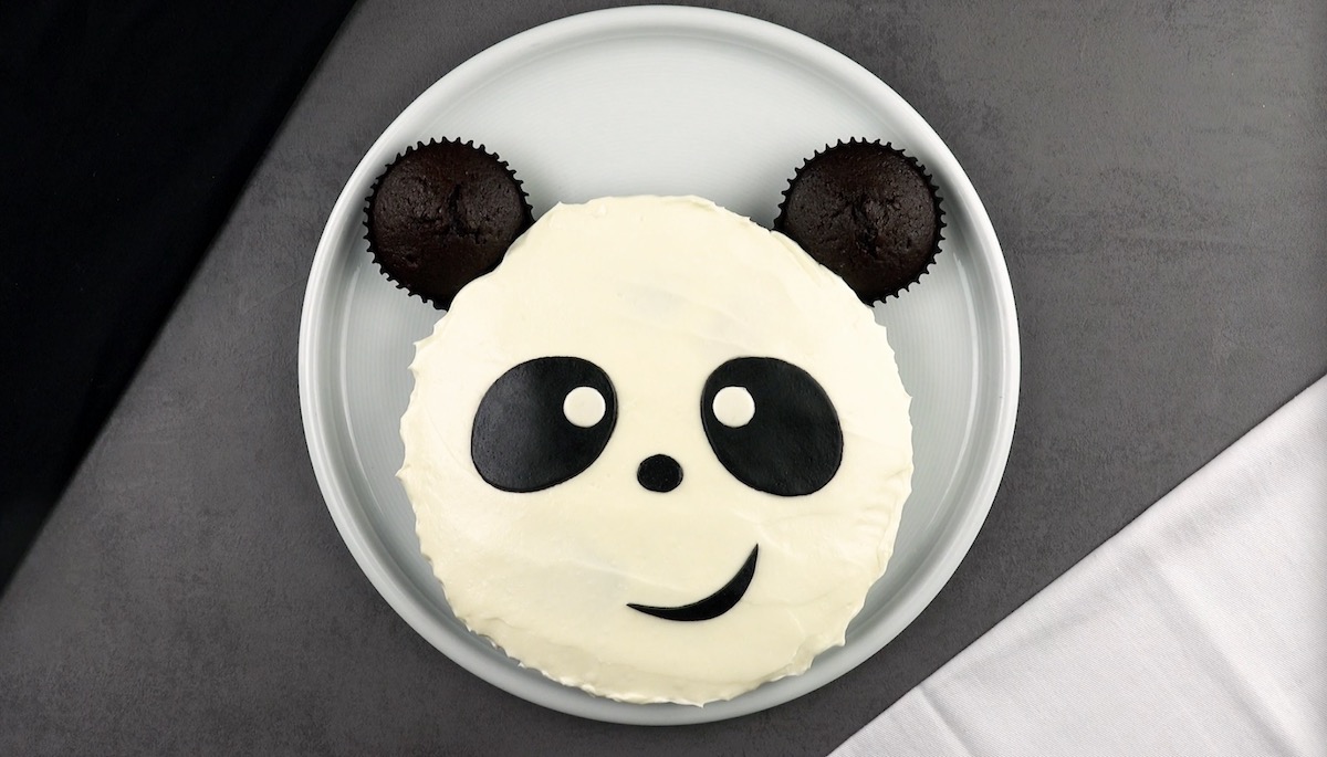 2.3) Löse die Springform und bestreiche den Kuchen mit dem Frischkäse-Frosting. Stelle nun die zwei extra Schokomuffins wie Pandaohren an den Cupake-Kuchen.