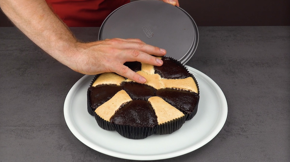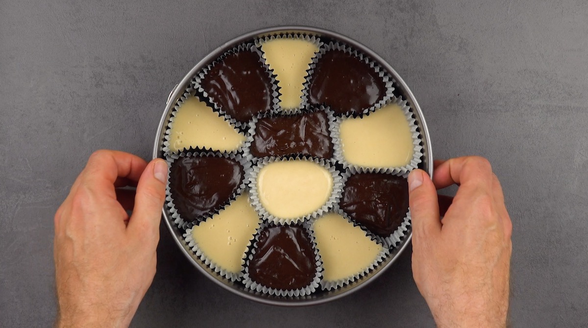 2.1) Rühre als Erstes die beiden Kuchenteige an. Lege nun eine Springform (26–28 cm Durchmesser) mit Papiermuffinförmchen aus und befülle diese zu drei Vierteln mit Vanille- bzw. Schokokuchenteig. Backe das Ganze dann für ca. 35 Minuten bei 160 °C Umluft.