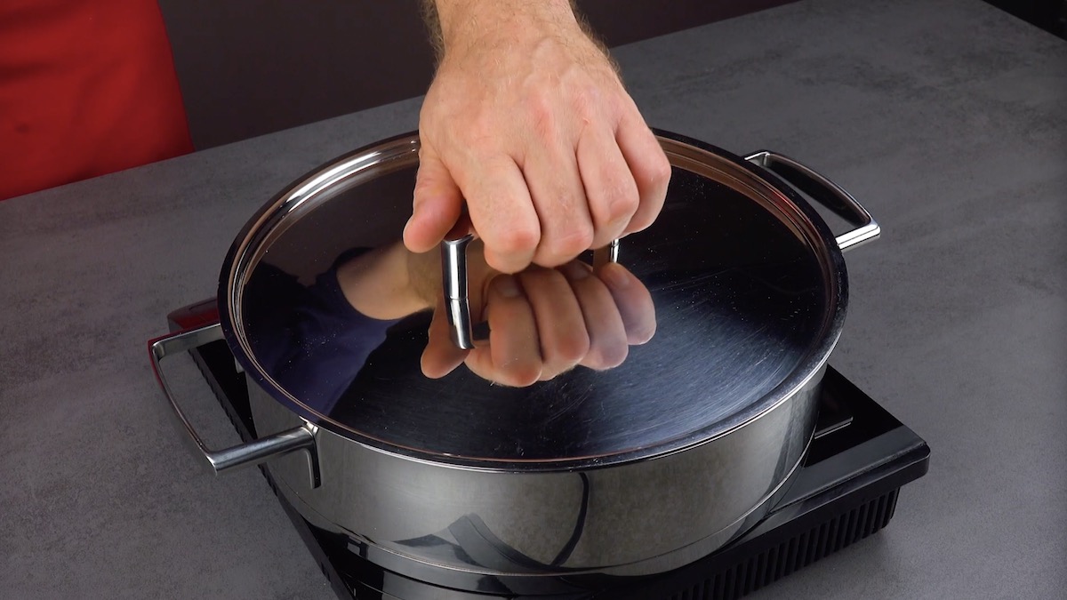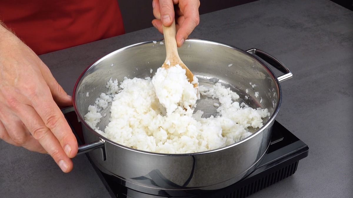 3.2) Nimm den Topf vom Herd und lass den Reis für weitere 10–12 Minuten aufquellen, nimm dafür jedoch den Deckel ab und lege ein Handtuch über den Topf. Rühre dann den Reisessig unter und lass den Reis abkühlen.
