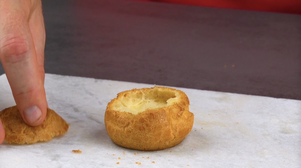 1.2) Lass die Windbeutel auf einem Rost komplett abkühlen und schneide von ihnen jeweils oben einen Deckel ab.