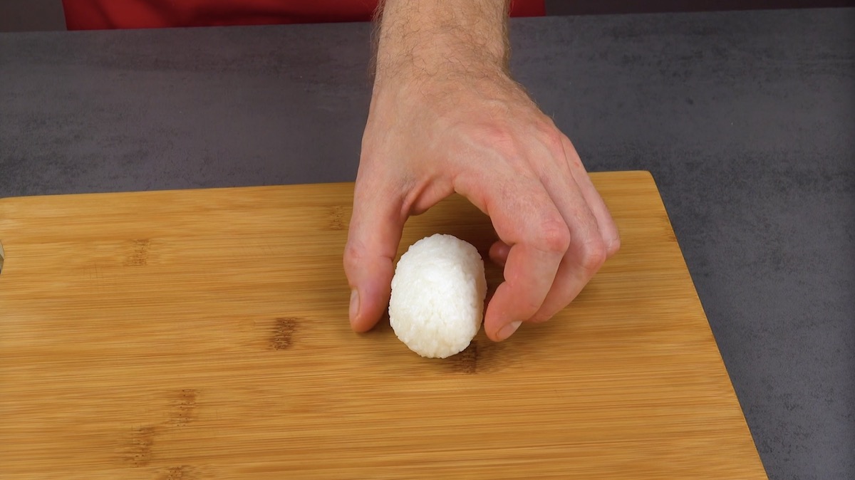 3.3) Forme den Reis zu etwa handtellergroßen, ovalen Pandakörpern.