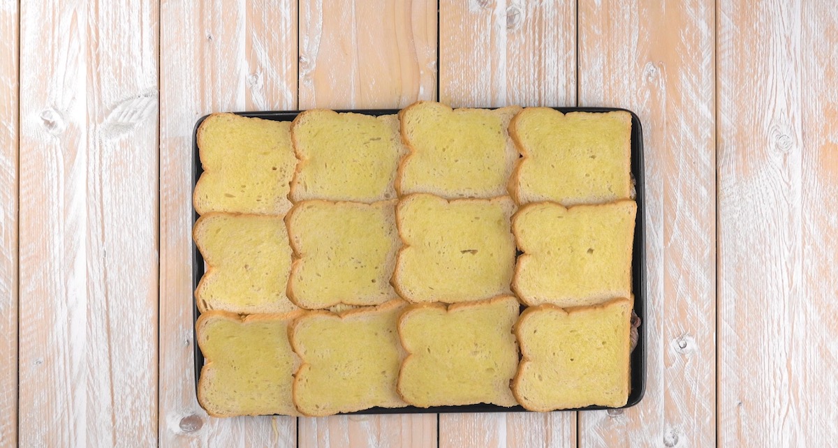 10.) Bedecke das komplette Backblech erneut mit Toastbrotscheiben. Schmilz die zweite Portion Butter und streiche das Brot damit ein.