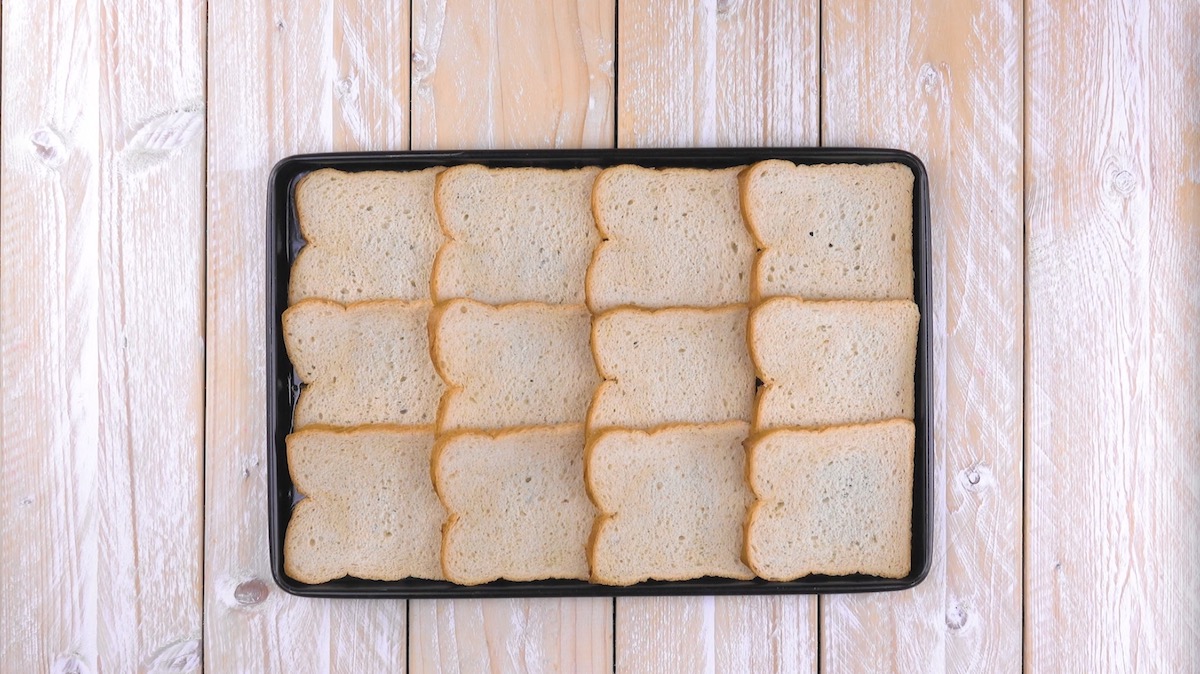 3.) Belege das eingefettete Backblech jetzt mit Brotscheiben.