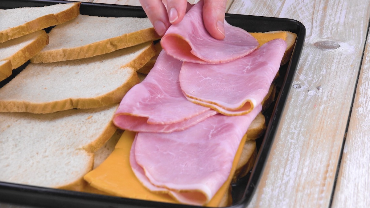 4.) Lege auf die ersten drei Brotscheiben je eine Scheibe Cheddar. Verteile darüber den Kochschinken.