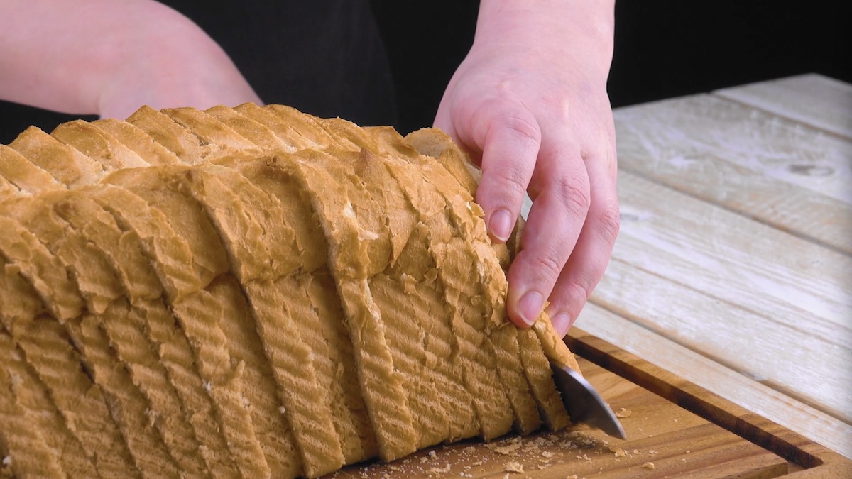 Am besten schneidest du das Brot vor dem Servieren in kleine Quadrate, so wird es zum handlichen Partysnack.