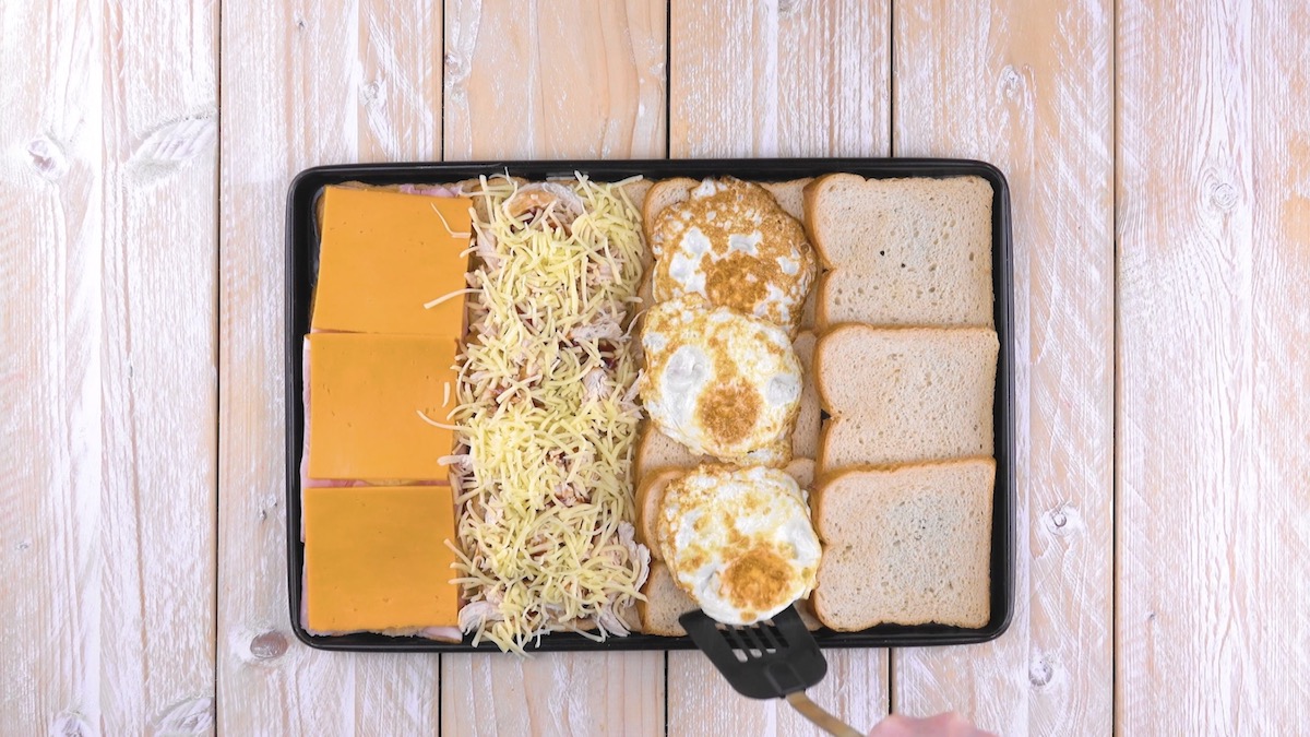 7.) Auf die dritte Toastbrotreihe kommen nun zunächst die beidseitig angebratenen Spiegeleier.