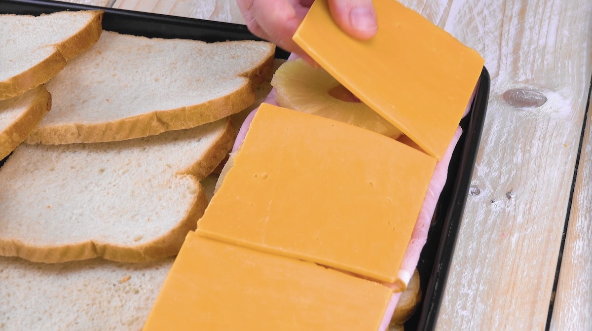 5.) Lege dann auf jede mit Cheddar und Schinken belegte Brotscheibe je eine Scheibe Ananas. Bedecke diese wiederum mit Cheddar.