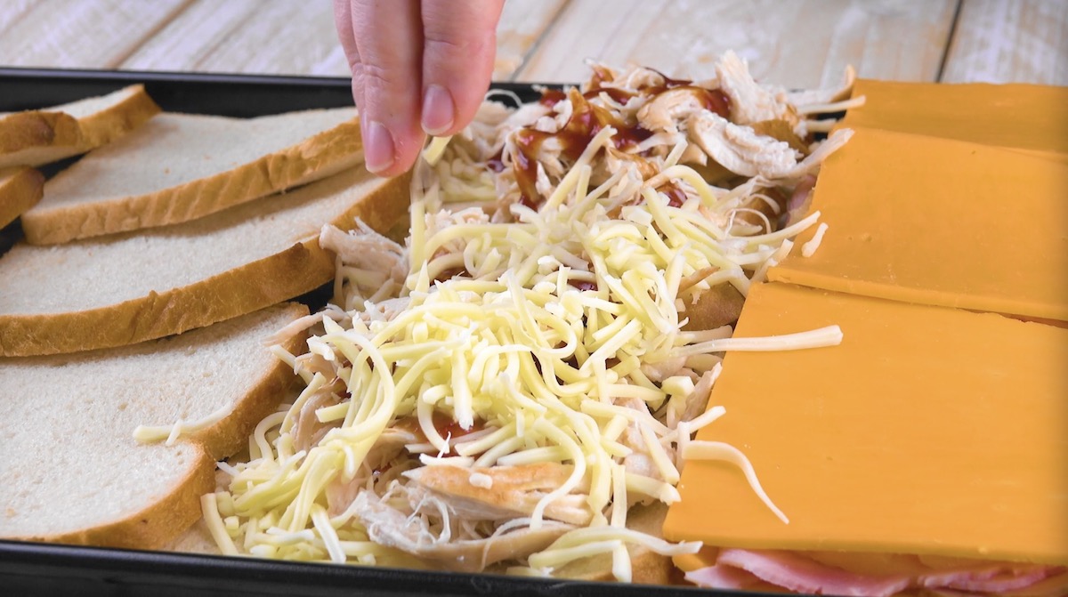 6.) Verteile auf der nächsten Toastbrotreihe zunächst die Hälfte des geriebenen Goudas. Bedecke diesen dann mit dem kleingerupften Hühnchen, gib nach Belieben BBQ-Sauce darüber und toppe das Ganze mit dem restlichen geriebenen Käse.