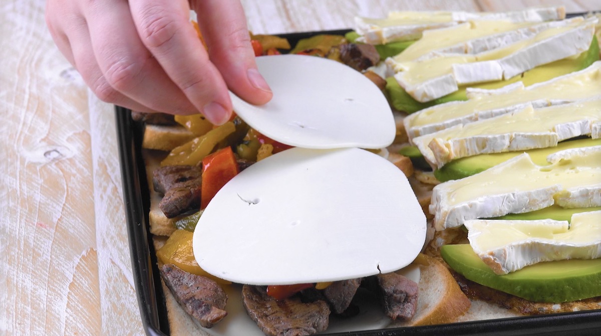 9.) Verteile auf der letzten Toastbrotreihe zunächst drei Scheiben Mozzarella, darüber dann die Rinder- und Paprikastreifen und bedecke das Ganze zum Abschluss mit drei Mozzarellascheiben.
