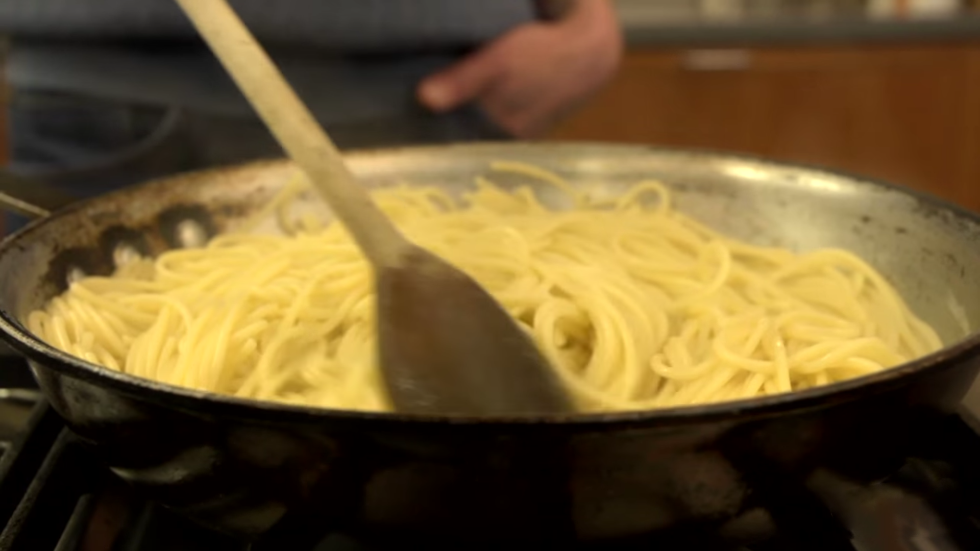 Los geht es damit, dass man die Pasta in eine Pfanne mit dem passenden Durchmesser legt, statt in einen Topf, und dann so viel Wasser hinzugibt, dass die Nudeln vollständig bedeckt sind. Durch die größere Fläche der Pfanne benötigt man viel weniger Wasser. Außerdem kleben die Nudeln nicht zusammen, da sie zuerst in kaltem Wasser schwimmen.
