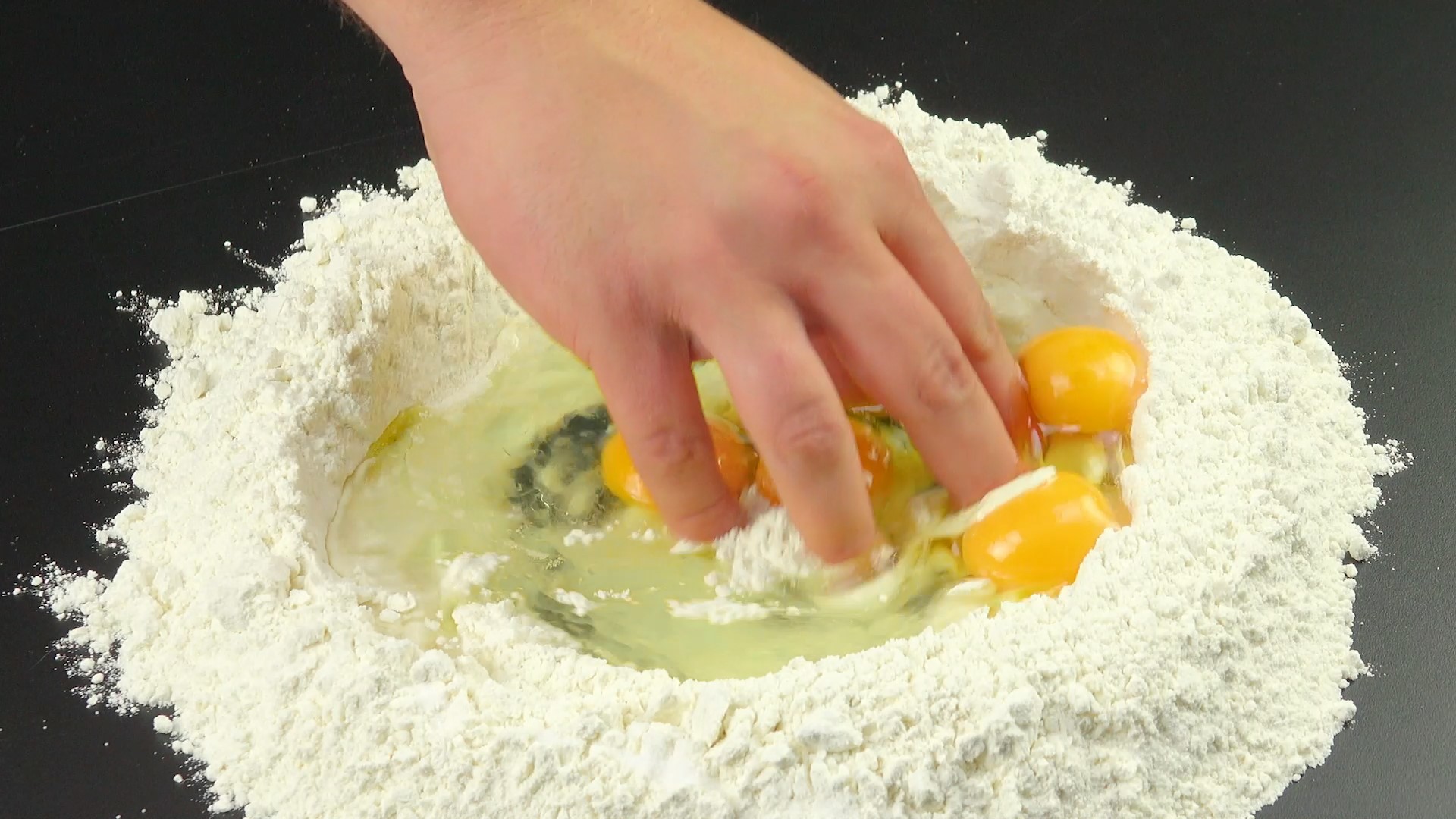 3.) Für den Teig gibst du das Mehl auf deine Arbeitsfläche und streust das Salz darüber. Mache nun eine Mulde in die Mitte des Mehls und gib die Eier, das Öl und das Wasser hinein. Rühre diese Mischung nun vorsichtig mit den Fingern um und verknete sie mit dem Mehl anschließend zu einem glatten Teig.