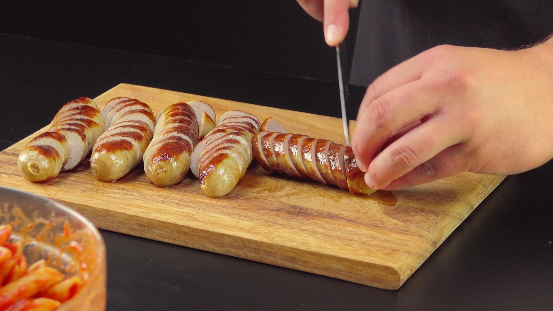 2.) Gib für die Füllung nun zunächst die Tomatensoße über die Penne und vermische beides gründlich. Anschließend brätst du die Würstchen und schneidest sie in dünne Scheiben.