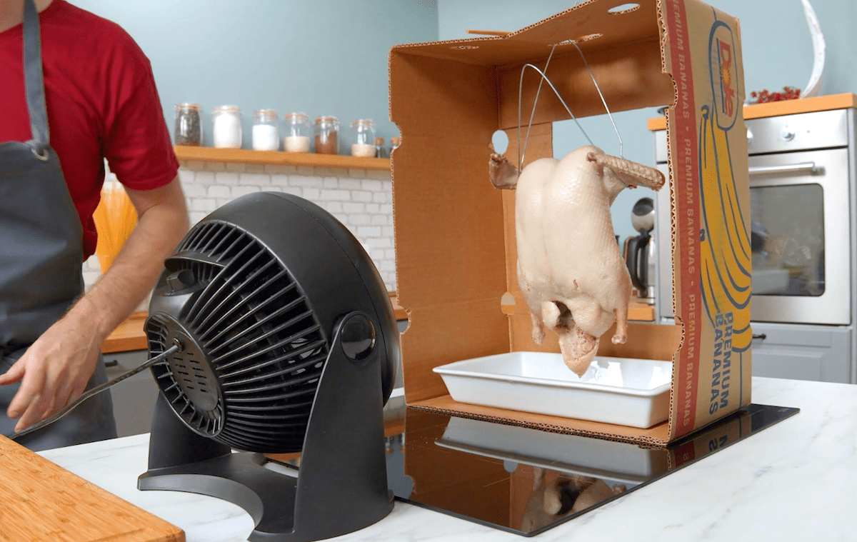 4. Hänge die Ente nun mithilfe von Essstäbchen in einen großen Karton und stelle einen Teller o. Ä. unter die Ente. Trockne die Ente anschließend mit einem Ventilator. Die Haut muss möglichst trocken werden, damit später die Glasur an ihr haften bleibt.