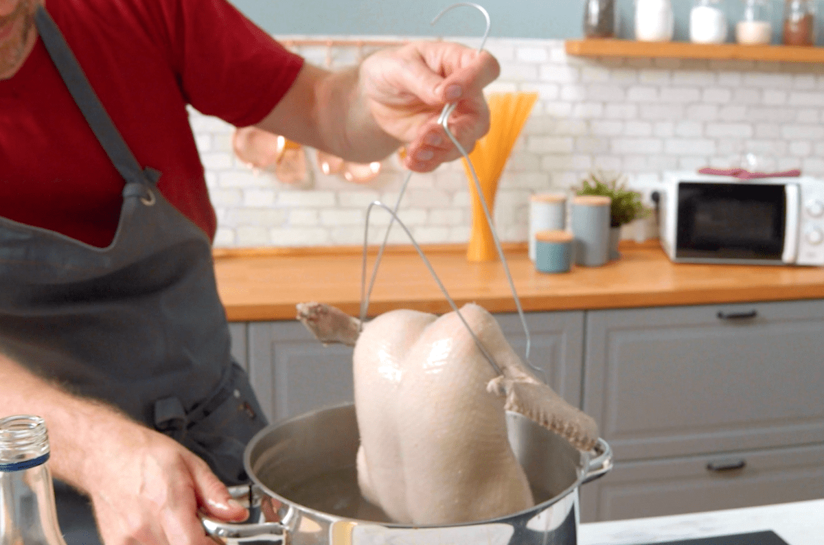 1. Biege den Kleiderbügel so zurecht, dass du die Ente an ihm aufhängen kannst. Bringe Wasser und Essig zum Kochen, lege die Ente für 5 Minuten hinein und tupfe sie anschließend trocken.