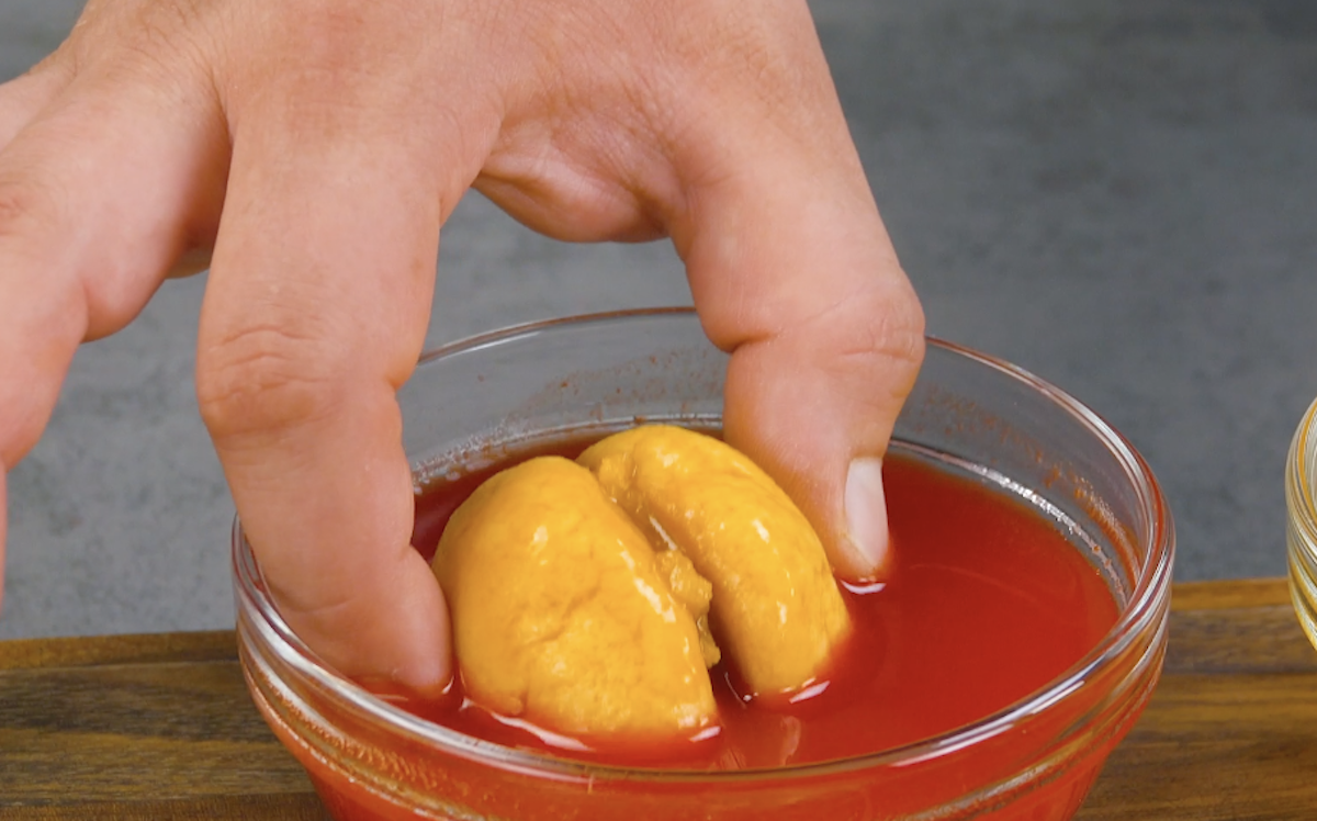 6. Gib Pfirsichsaft in 2 Schüsseln und füge jeweils rote und orange Lebensmittelfarbe hinzu. Tunke die Kekse von einer Seite in den rot gefärbten Saft und von der anderen Seite in den orange gefärbten Saft.