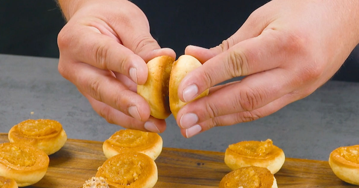4. Verrühre diese Krümel mit Pfirsichkonfitüre und fülle die ausgehöhlten Kekse mit dieser Mischung wieder auf.