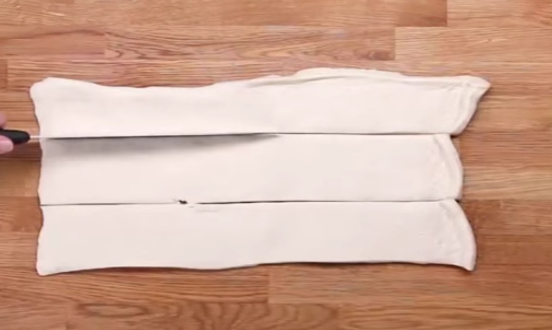 Als erstes brauchst du Pizzateig, egal ob Fertigprodukt oder kurzerhand selbstgemacht. Schneide ihn in drei lange Streifen. Für jede Pizza-Brezel brauchst du allerdings nur einen einzigen.