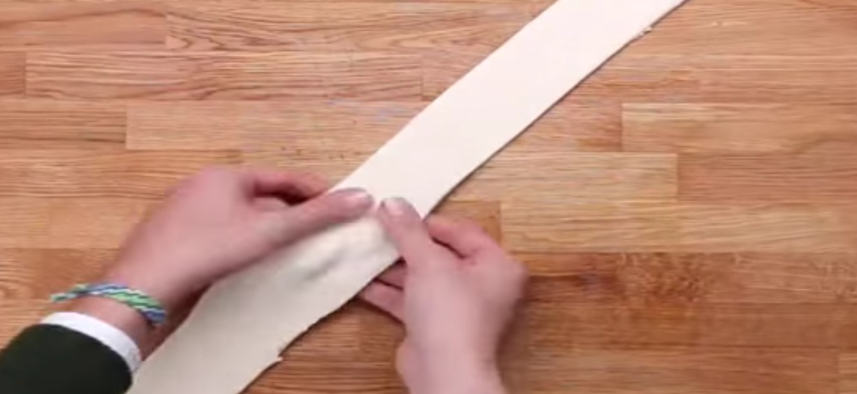Den Streifen Pizzateig musst du dann ein bisschen in die Länge ziehen und etwas breitwalzen.