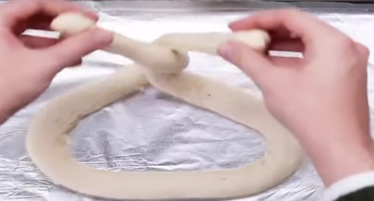 Die zwei Enden der langen Teigschlange musst du zwei mal umeinanderschlingen.
