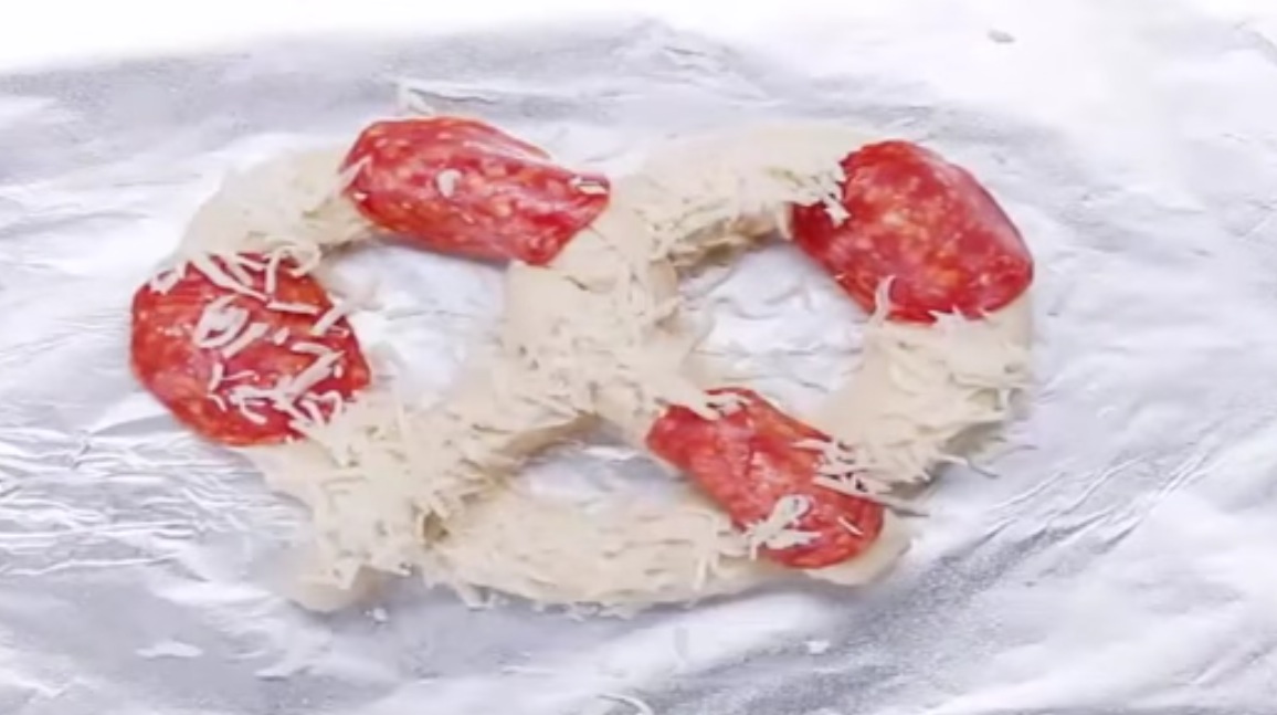 Jetzt kannst du die Brezel ganz nach Herzenslust belegen. In unserem Beispiel wird die Pizza-Brezel mit leckerer Salami und Käse belegt, aber du kannst sie auch mit Tomatensoße bestreichen oder andere Zutaten darüber streuen.