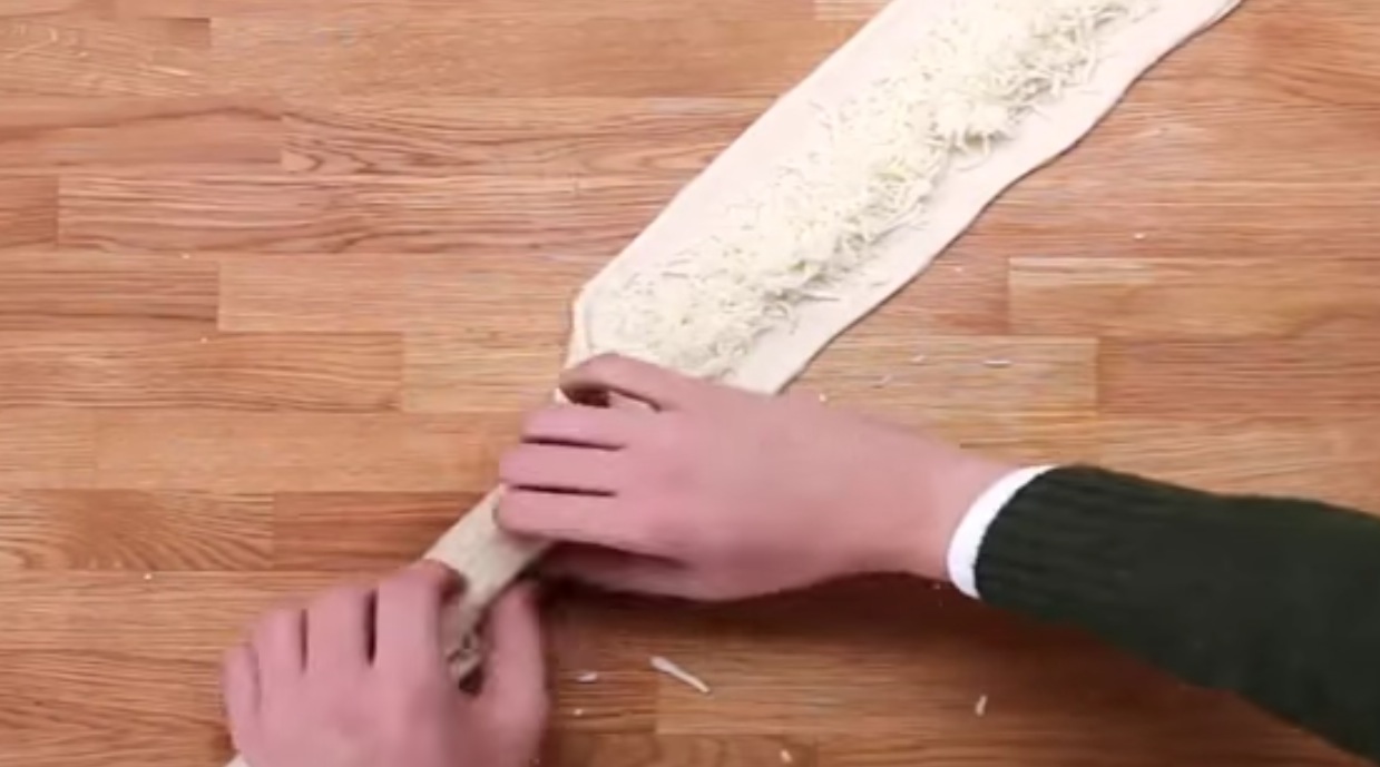 Jetzt rolle den Streifen Pizzateig vorsichtig zusammen, sodass du eine lange Rolle hast, die mit leckerem Käse gefüllt ist. Alle Lücken und Fugen werden sorgsam zugedrückt.