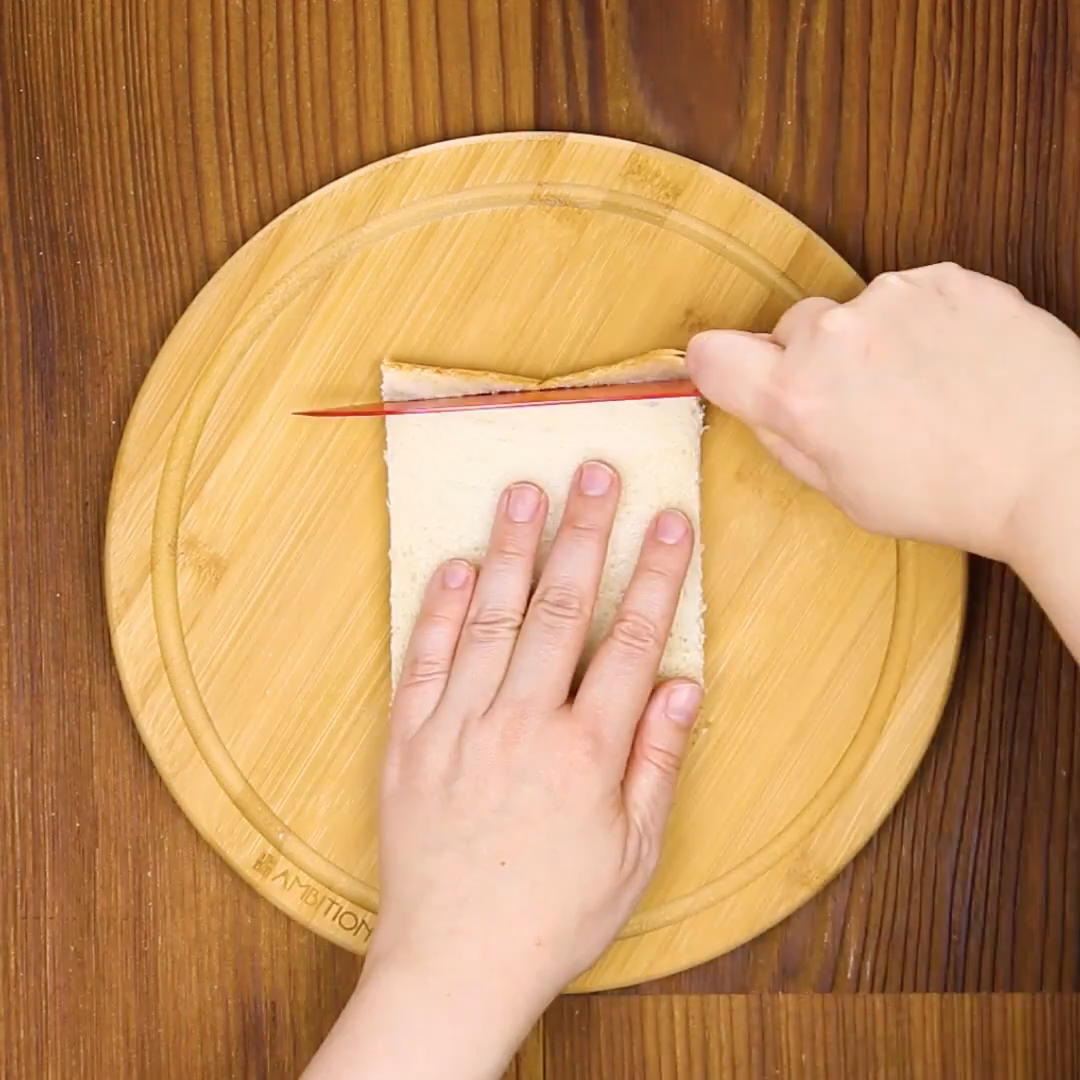 2.) Entrinde die Toastscheiben und rolle sie mit einem Nudelholz platt.
