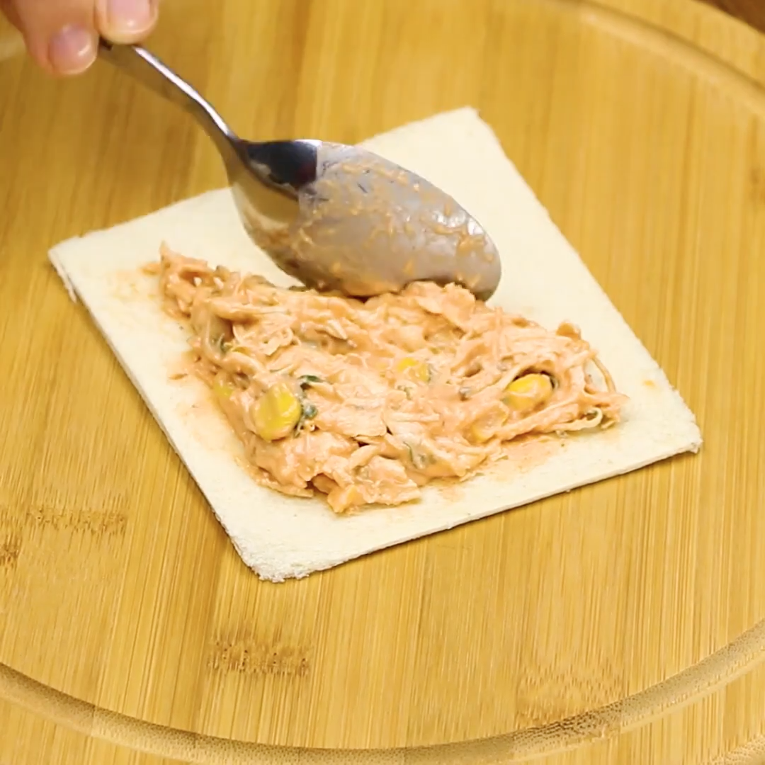 3.) Dann die Füllung auf die plattierten Toastbrotscheiben geben. Pro Tasche brauchst du etwa einen Esslöffel der Masse.