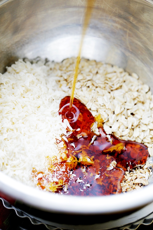 Mische erst die trockenen Zutaten für den Boden, dann gib den Honig oder den Sirup hinzu, und vermische alles zu einer einheitliche Masse.