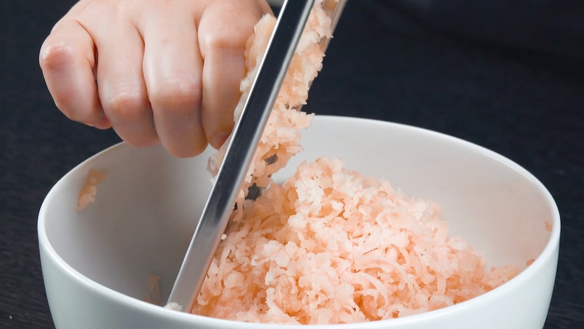 1. Friere das Hähnchenbrustfilet ein. Reibe anschließend die gefrorenen Hähnchen mit einer Reibe in feine Stücke.