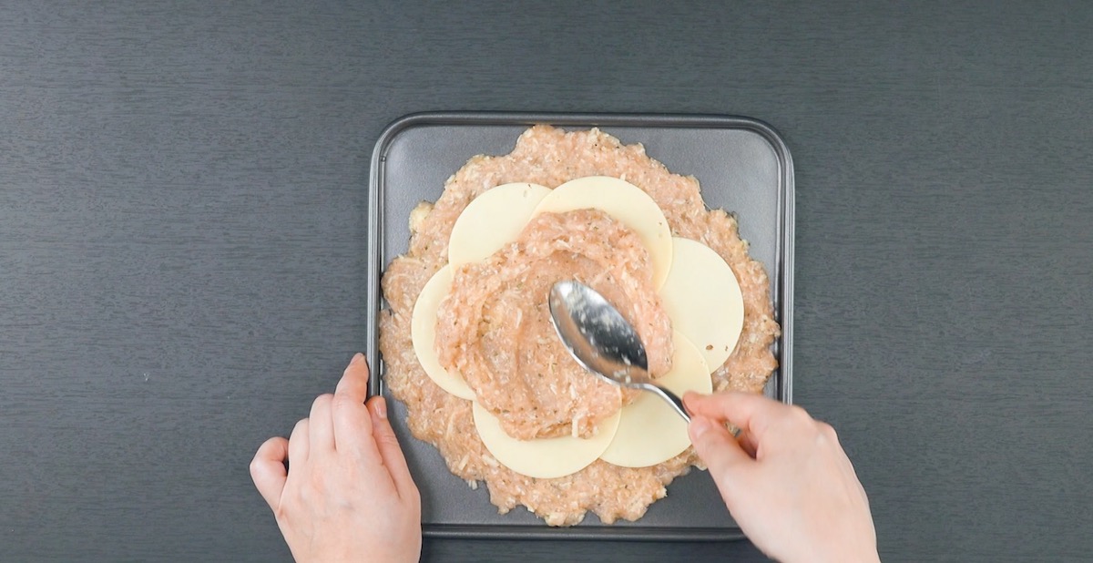 2. Vermenge das geriebene Hähnchenbrustfilet mit Parmesan, italienischen Kräutern, Mozzarella, Knoblauch und einem Ei. Verteile die Hälfte der Hähnchenmasse auf einem mit Backpapier ausgelegten Blech. Belege die Hähnchenmasse dann mit den Mozzarellascheiben und bedecke diese wiederum mit der restlichen Hähnchenmasse. Drücke diese gut an, bevor der Pizzaboden für 15 Minuten bei 200 °C Ober- und Unterhitze goldbraun gebacken wird.