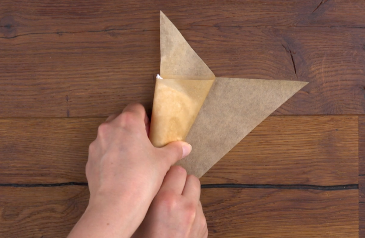 1.) Falte zuerst einen Kegel aus einem A4 Blatt. Das geht folgendermaßen: Falte das Blatt in der Mitte zusammen zum A5-Format, dann zum A6-Format. Falte nun eine Ecke der Längsseite zur anderen Längsseite, so dass sich ein Trapez ergibt. Nun schlägst du die ungefaltete Längsseite bündig mit der zuvor gefalteten Kante aufeinander. Das Blatt sollte nun wie ein Drachen aussehen. Drücke das Papier zu einem Kegel und schlage die spitz nach oben stehende Kante nach innen ein. Nun kannst du den Kegel in Backpapier einschlagen. Von diesen Kegeln stellst du vier Stück her.