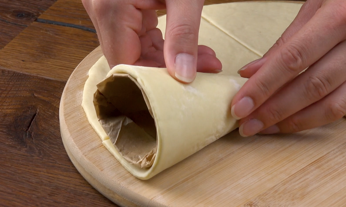 2.) Schneide den Pizzateig über Kreuz in vier identisch große Portionen. In jedes der Stücke rollst du einen Papierkegel ein.